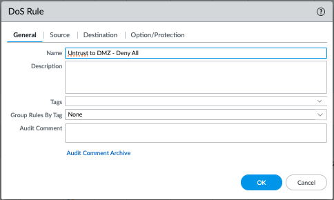 Nom de la règle DoS : Ne pas faire confiance à Ne pas faire confiance - Refuser tout - Zone source UDP et TCP