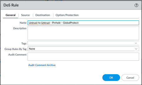 Nom de la règle DoS : Ne pas faire confiance à Ne pas faire confiance - Sténopé - Zone source GlobalProtect