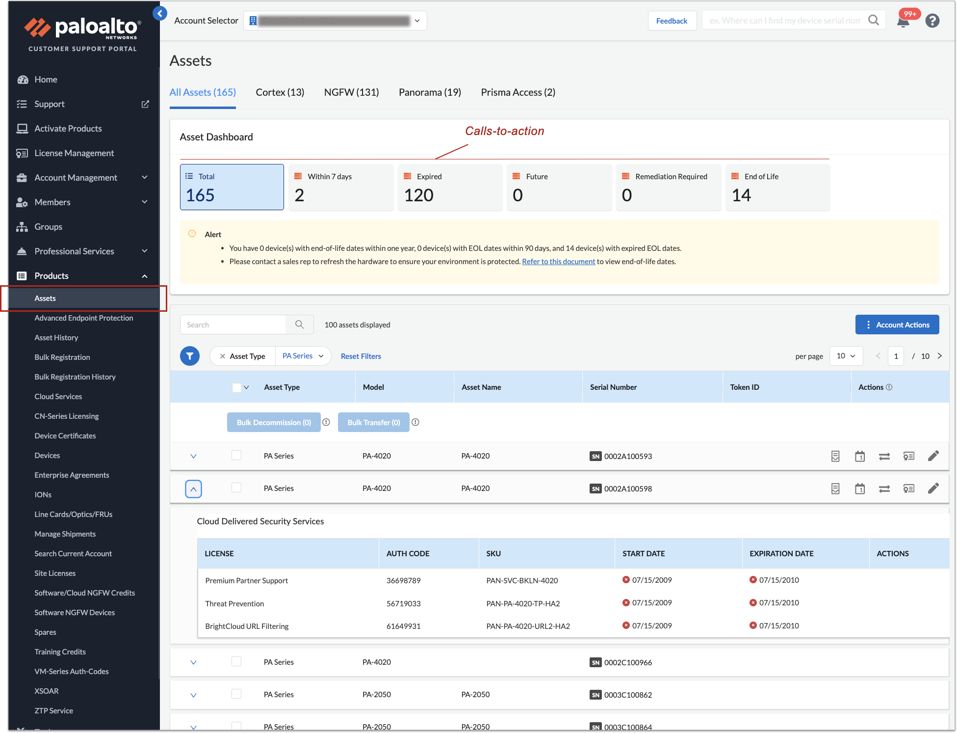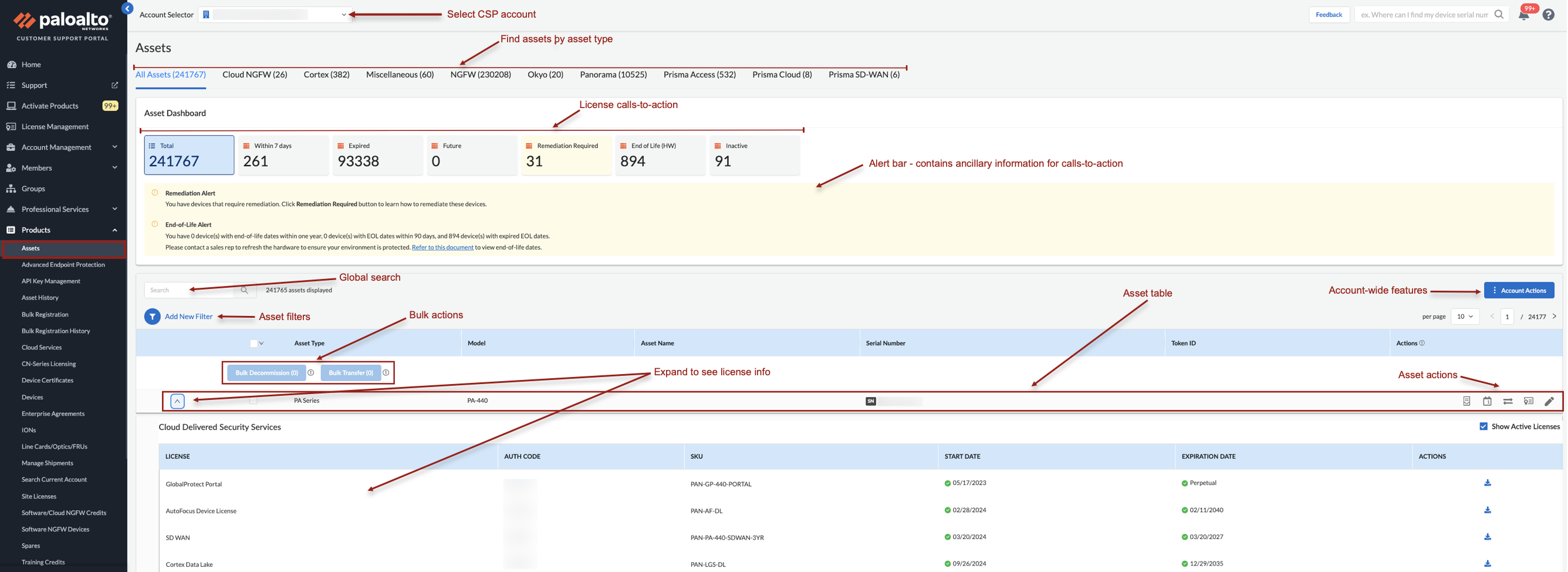 Use CSP Assets page to manage your portfolio of Palo Alto Networks products: