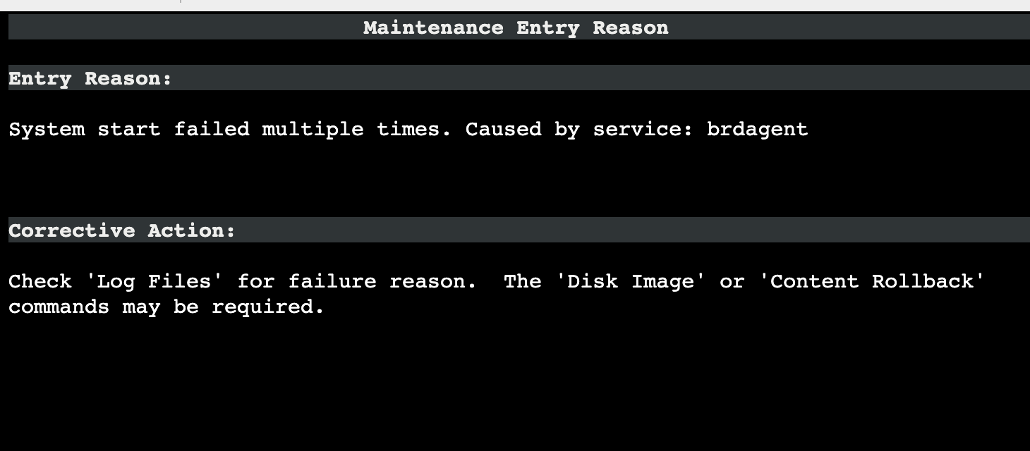 -0700 INFO: brdagent: exited, Core: False, Exit code: 1 -0700 CRITICAL: brdagent: Exitted 3 times, rebooting to the maintenance partition -0700 CRITICAL: brdagent: restarts exhausted, rebooting system -0700 INFO: chassis: early detection for slot1 (reason: brdagent exiting)