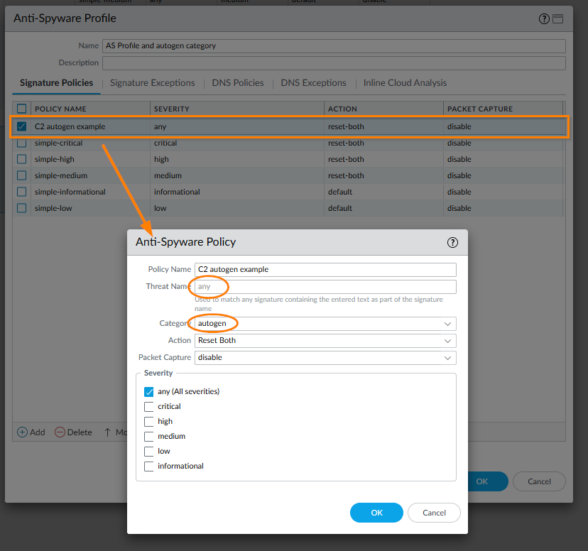 To set up a special category policy for C2 traffic with autogen signatures, you will need create it with "Category" set to "autogen" and "Threat Name" set to "any" (blank), as shown in the screenshot below: