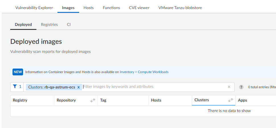 -> ただし、「モニター」->「脆弱性」->「イメージ」->「デプロイ済み」に移動して、クラスターまたはホスト名を検索しても、結果は見つかりません。