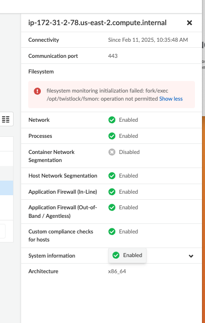 - Upon expanding the details, you see following error: "filesystem monitoring initialization failed: fork/exec /opt/twistlock/fsmon: operation not permitted "