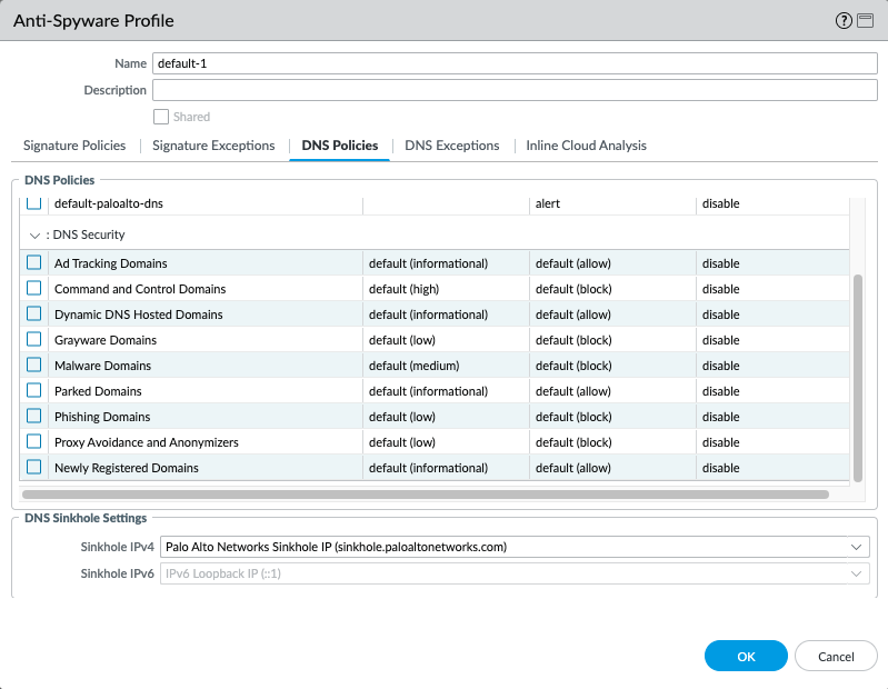 - DNS policies - Anti-Spyware profile