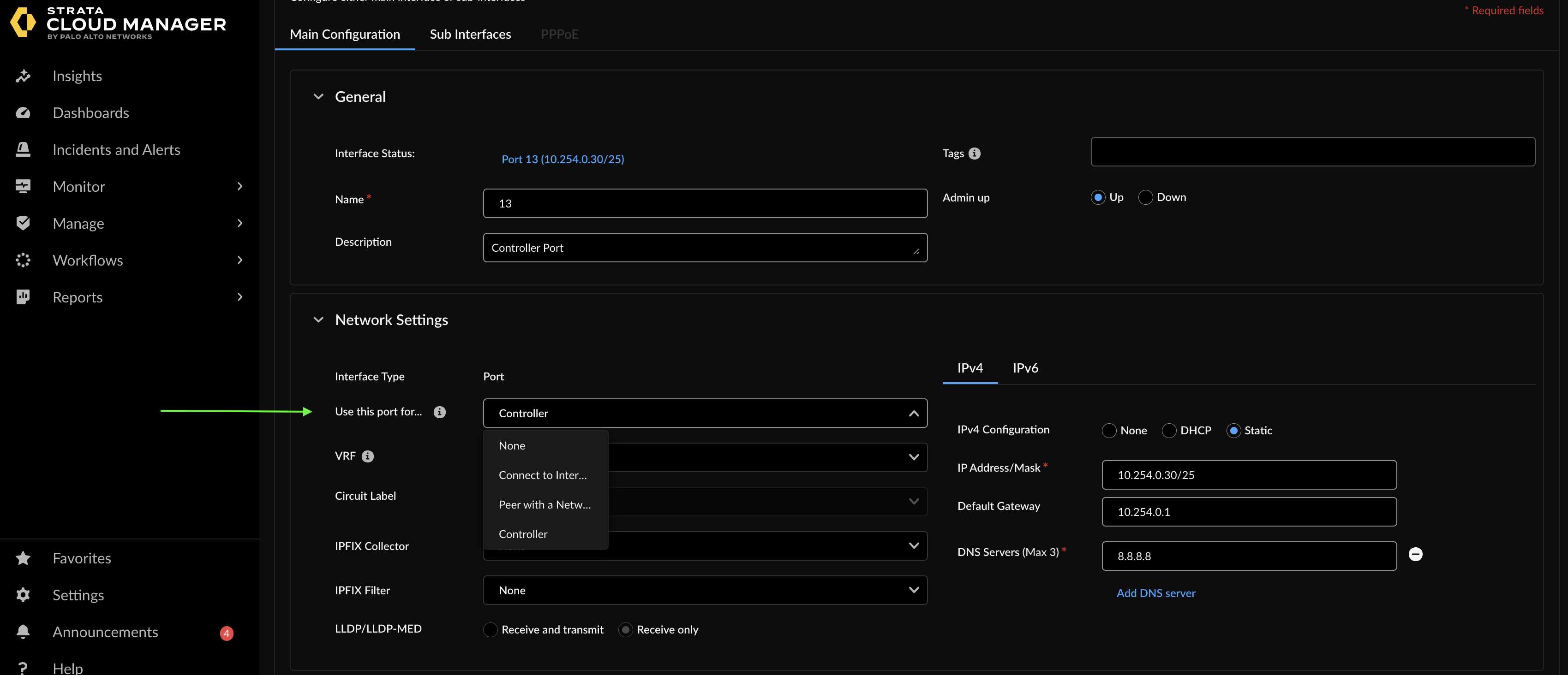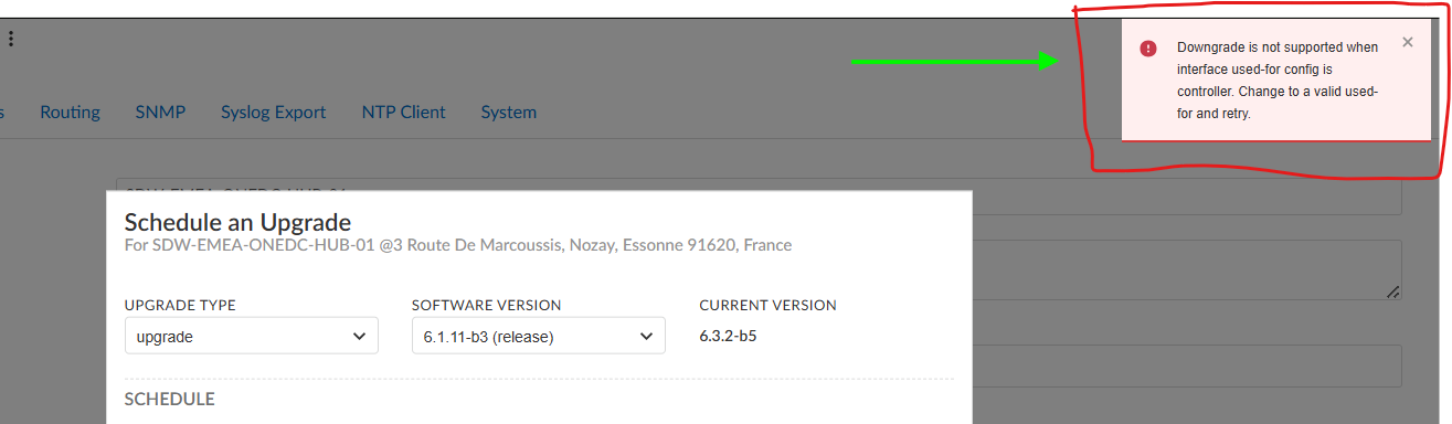 - Similarly, when the interface is configured as "used this port for Controller", error message. "Downgrade is not supported when interface used-for-config is controller. Change to a valid used for and entry" is displayed.