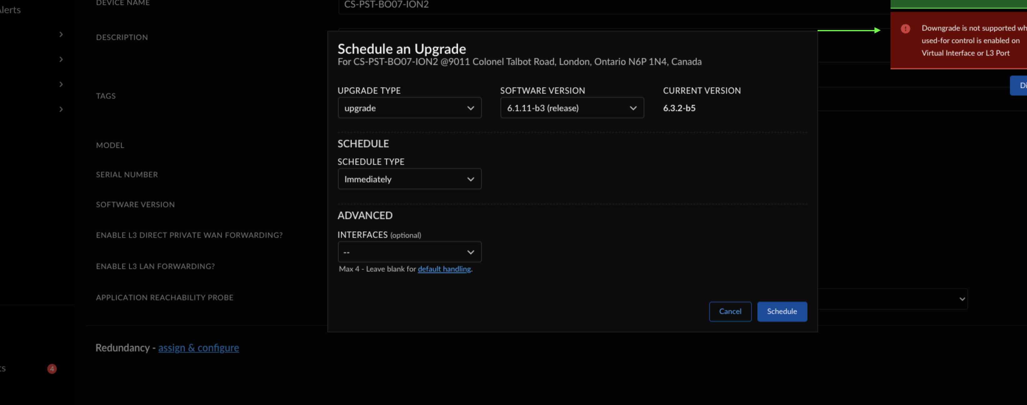 - If the interface is used as Controller or HA in version 6.3.x, then the downgrade fails.
