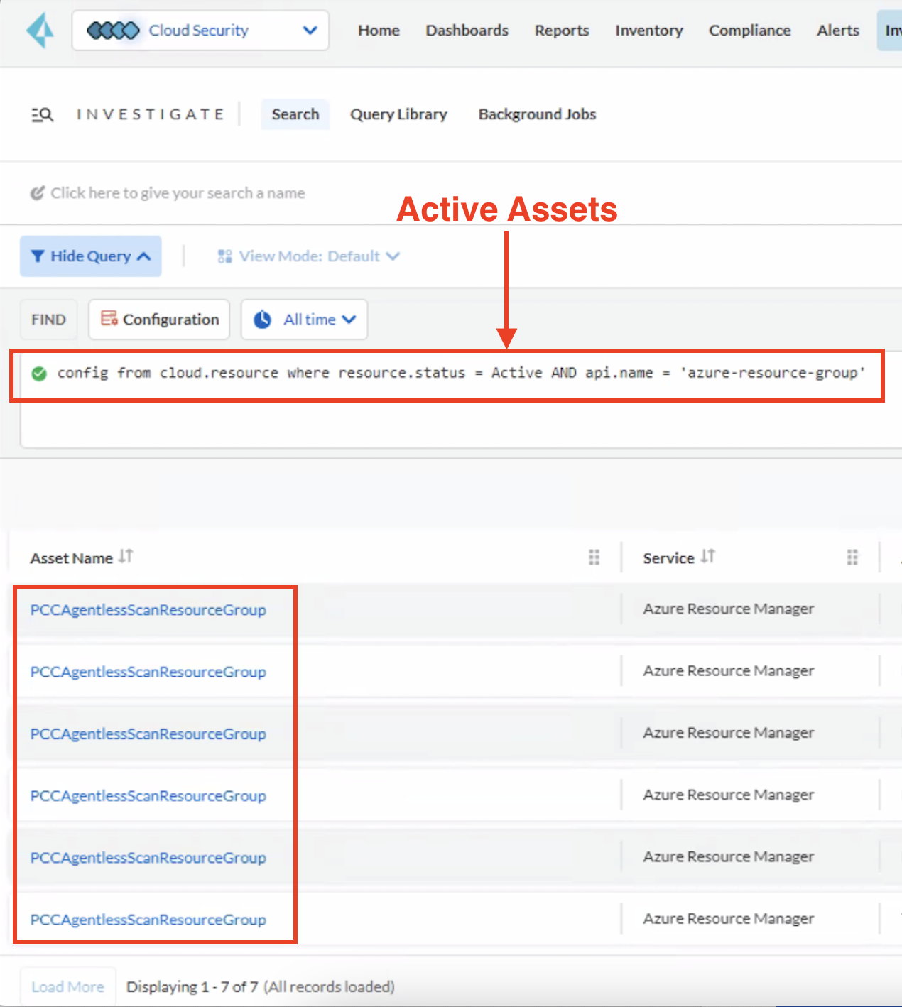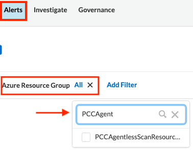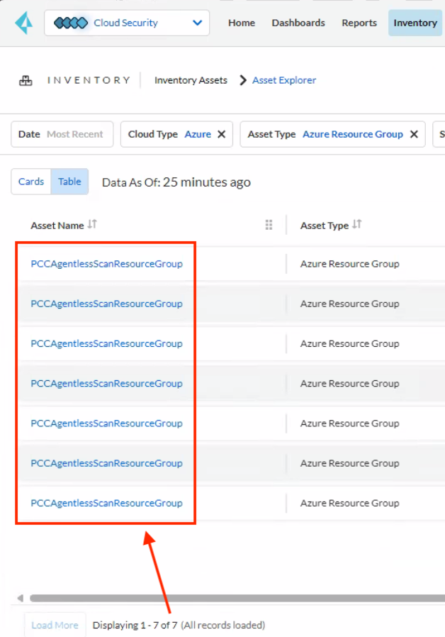 - In the above example, Multiple Resource entries for PCCAgentlessScanResourceGroup are seen in Inventory and Investigate tab (Count = 7)