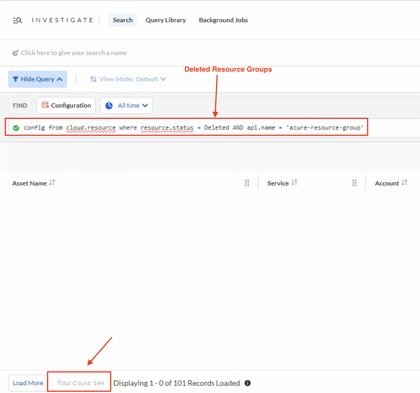 - Additionally, you can run a specific RQL Query to find the deleted 'Azure Resource Group' Assets (count is 144)