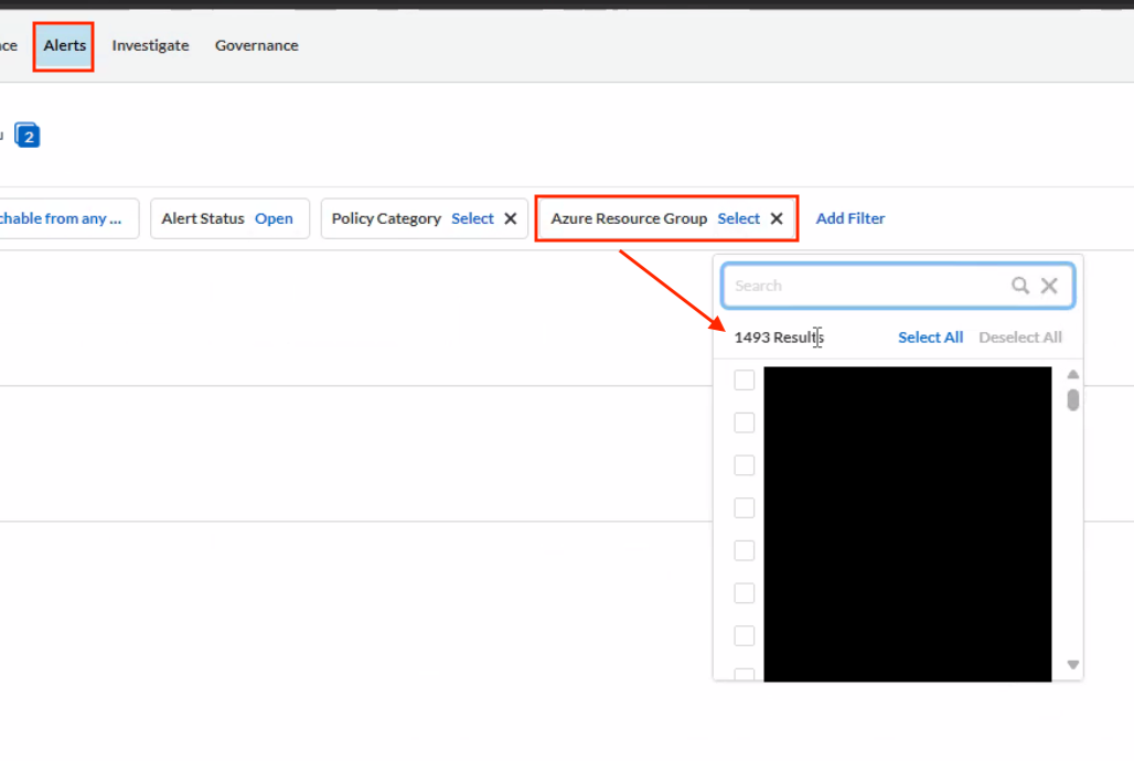 - 次に示すように、アラートとコンプライアンスには、特定の環境で 'Azure リソース グループ' の数 = 1493 が表示されます