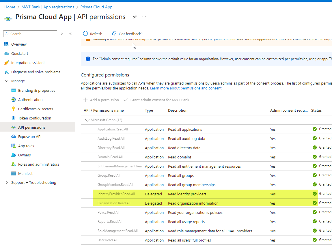 - Bitte beachten Sie, dass für die Berechtigungen [IdentityProvider.Read.All, Organization.Read.All], die Sie in der Azure-Konsole sehen,
