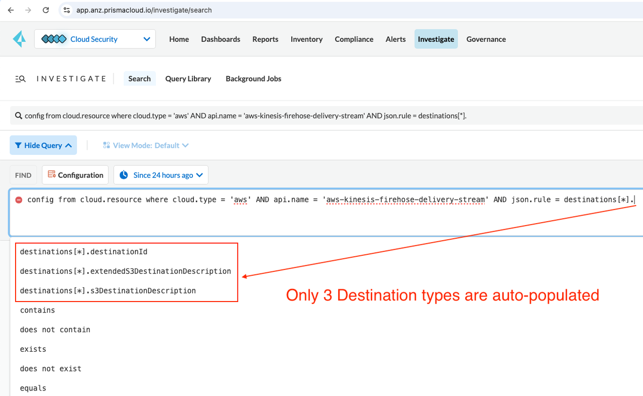 - However, when running the following RQL in Investigate tab, Prisma Cloud is only auto-populating 3 Destination Types