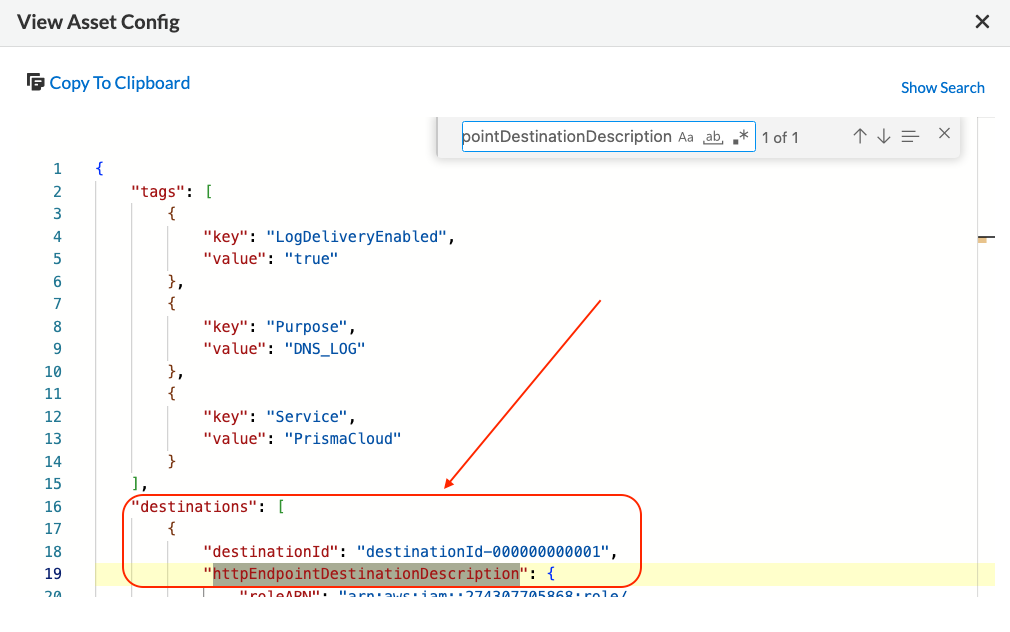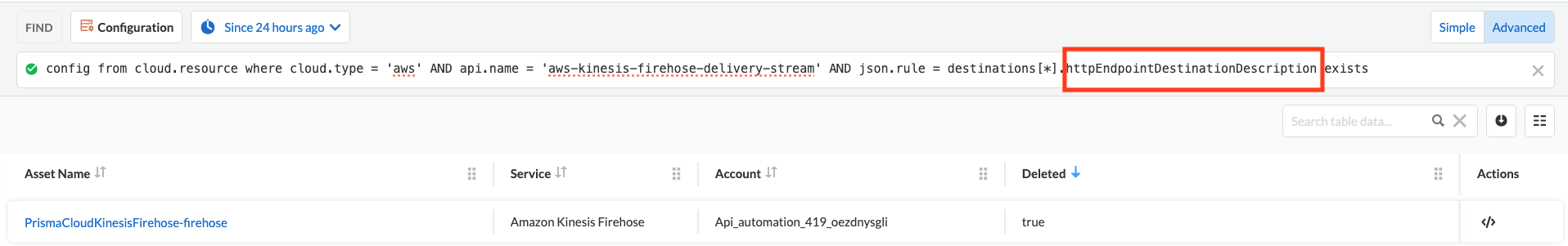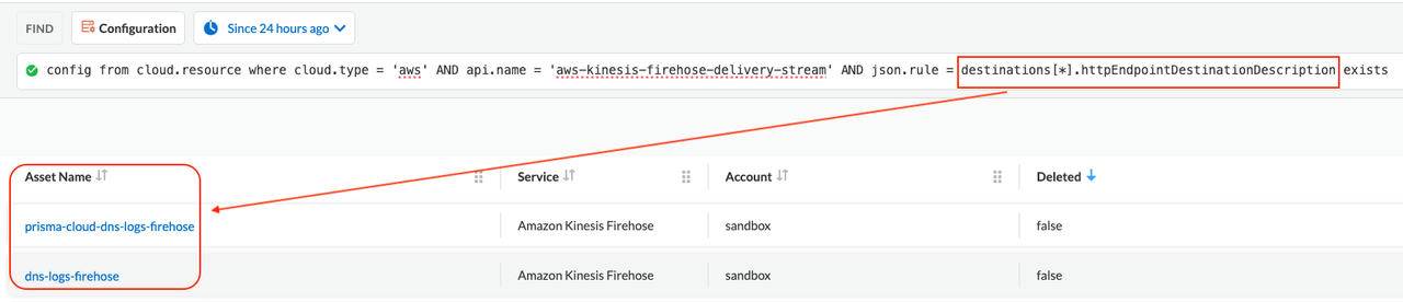 - When other Destination Types like httpEndpointDestinationDescription, that are described in DestinationDescription - Amazon Data Firehose and not listed by Prisma Cloud, are submitted in the following RQL query, they give expected results