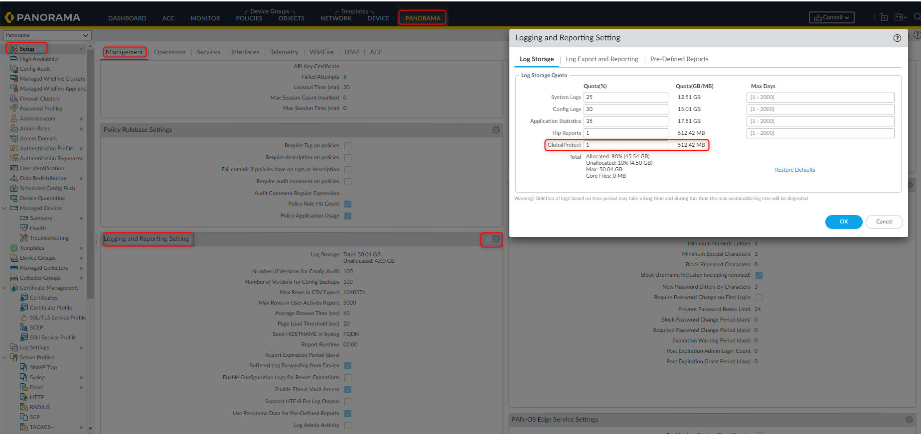 - On Panorama Web Management, navigate to Panorama > Setup > Management > Logging and Reporting Setting and click the Gear icon.