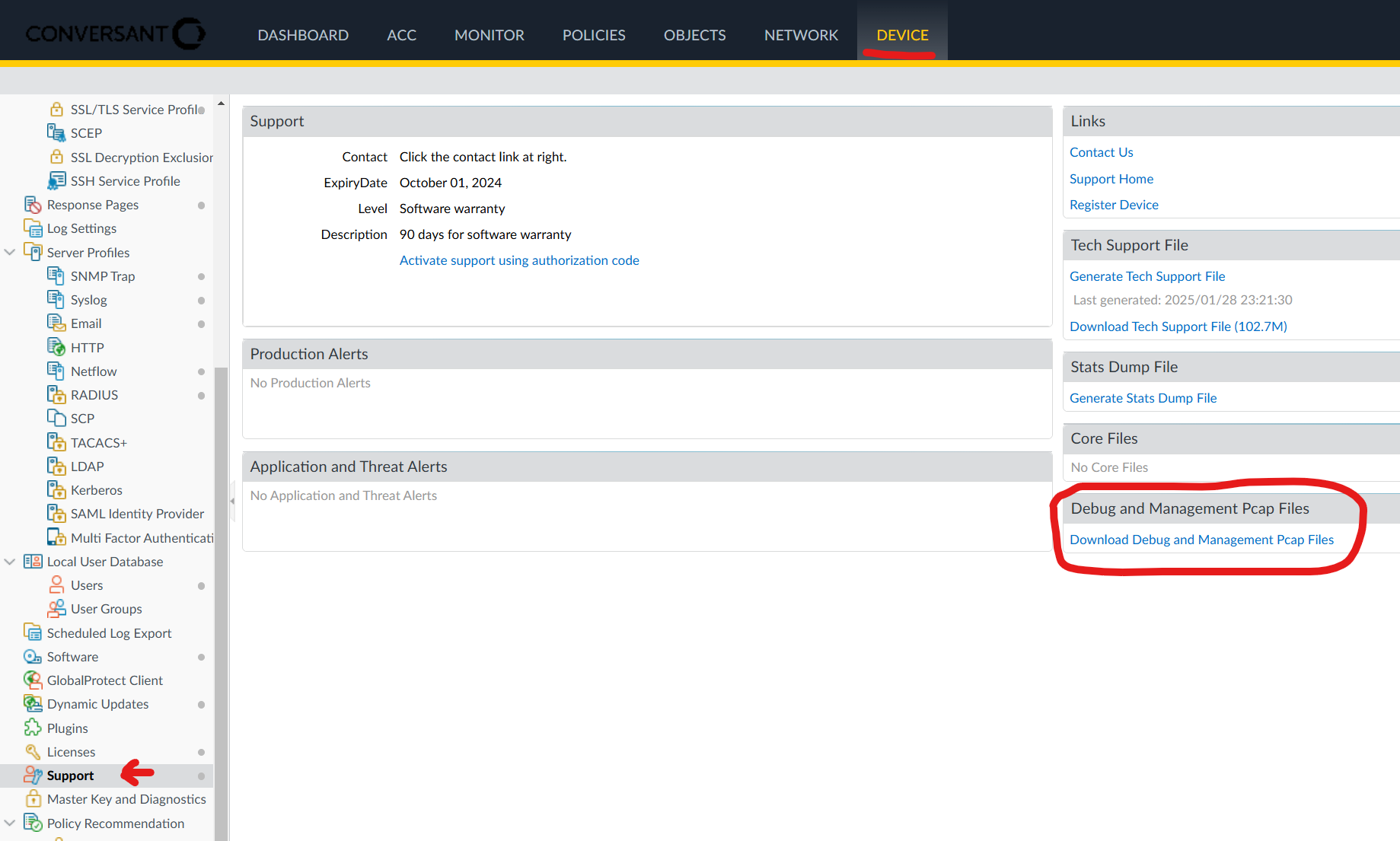 - The mgmt.pcap can also be downloaded via the GUI (if available on the PAN-OS version) under the Device > Support > Debug and Management PCAP Files menu by clicking the Download Debug and Management PCAP Files link.