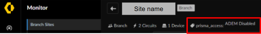 - The Autonomous DEM (ADEM) for Prisma Access Remote Sites doesn't work, with the message "prisma_access: ADEM Disabled" on Strata Cloud Manager > Monitor > Branch Sites > Prisma SD-WAN > List > Prisma SD-WAN Branch Sites > [Site name].