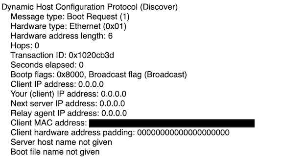 • PCAP taken on the ION LAN interface confirm that the PXE boot server and boot file information are missing in the DHCP DISCOVER message
