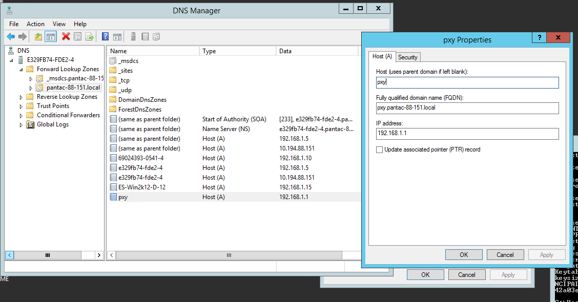 open dns manager > Forward lookup zones > pantac-88-151.local (domain of the AD) > Rt click > new host (A or AAAA) > add the name (pxy here) and IP (192.168.1.1).