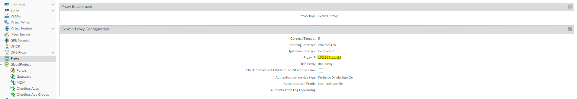 Where the IP (192.168.1.1) is used as the trusted interface IP(lan) in the firewall. Same IP is used as web proxy IP