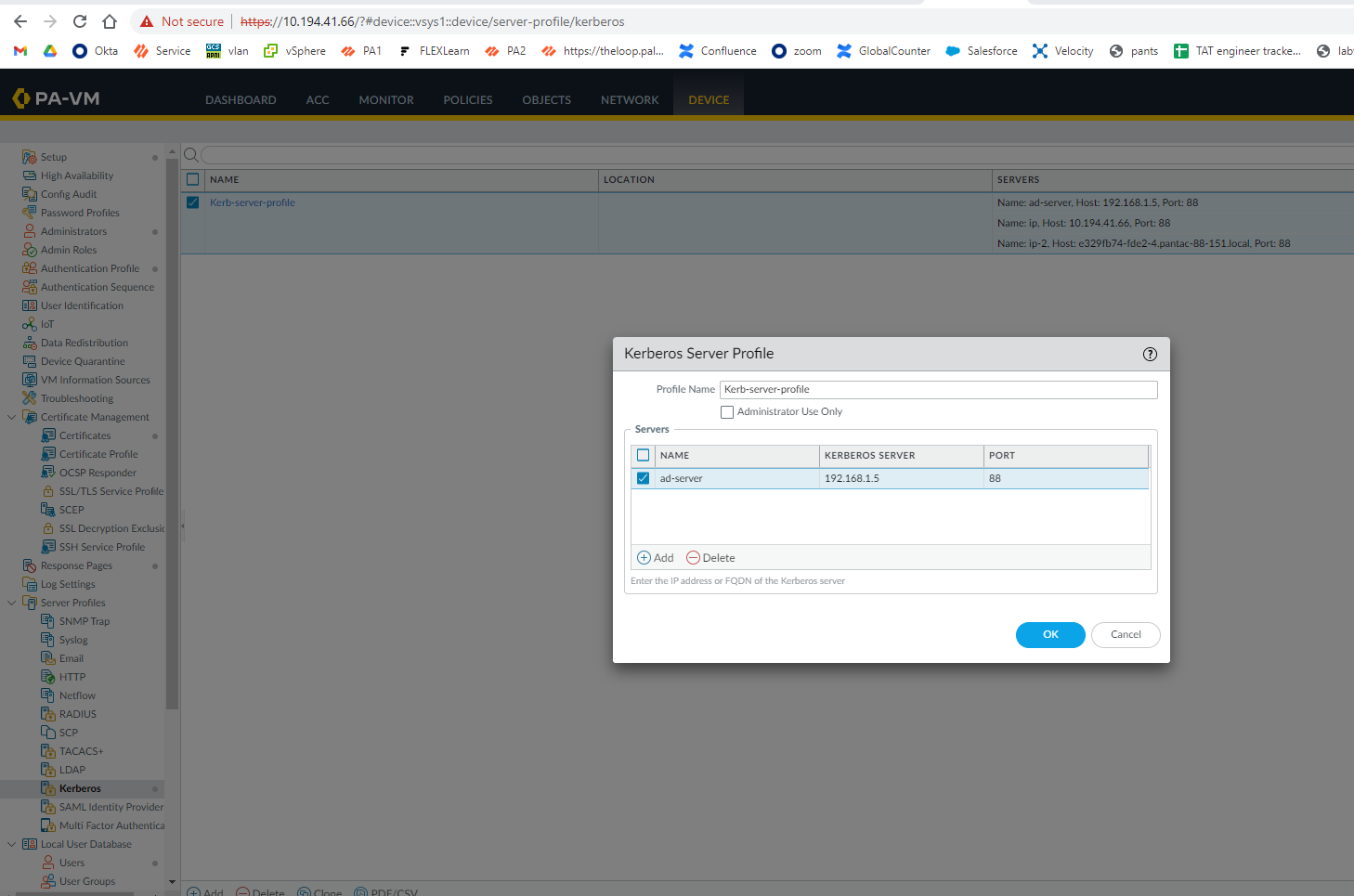 Device > server profile > Kerberos > Give a profile name > add > give the kerberos server IP/AD (here 192.168.1.5 )and port as 88