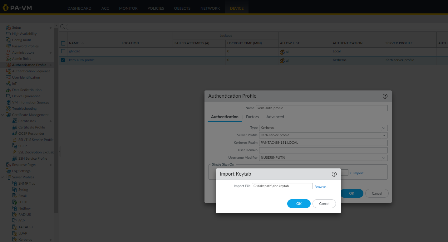 Device > authentication Profile > add > give name > Authentication type: Kerberos