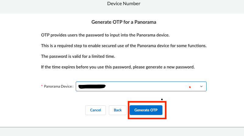 - Pour le type d'appareil, sélectionnez « Générer un OTP pour Panorama » et cliquez sur Suivant .