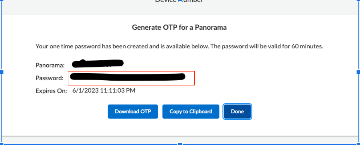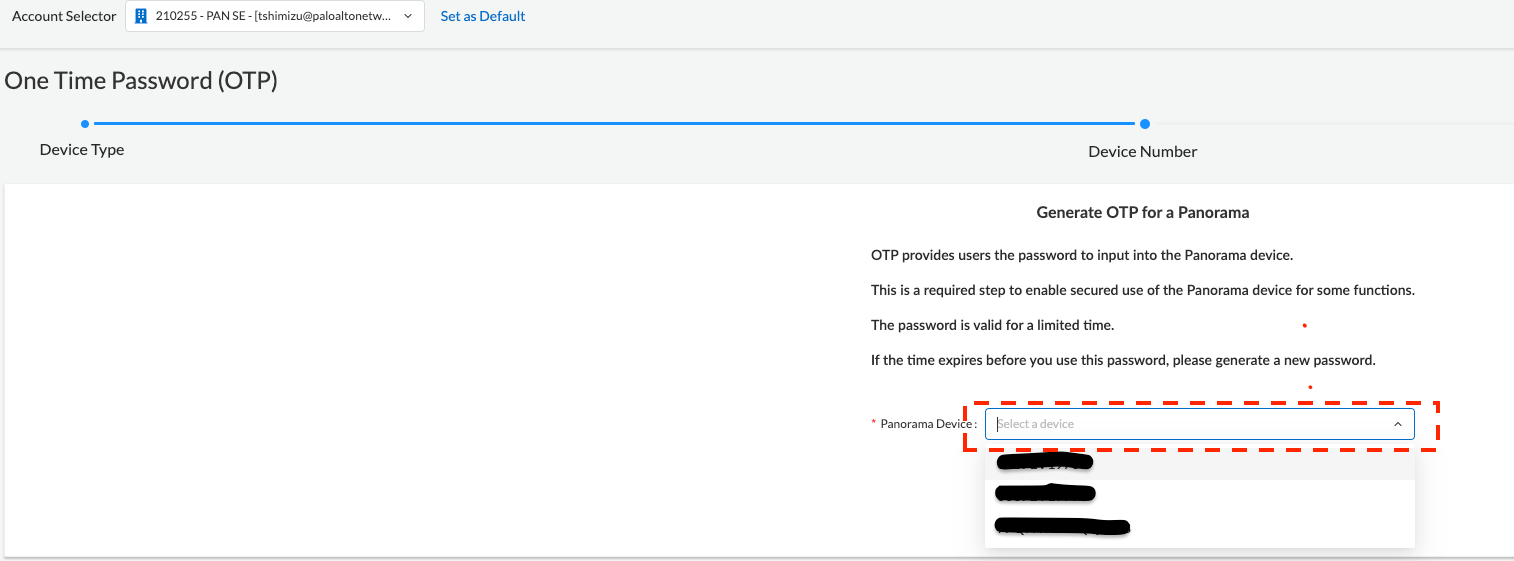 - デバイス タイプとして、「 Panorama のOTP を生成」を選択し、 「次へ」をクリックします。