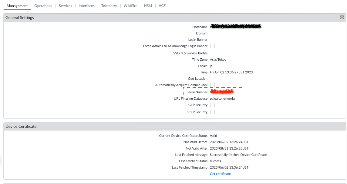 - GUI에서 Panorama 일련 번호를 기록해 두세요: Panorama > 관리 > 일반 설정 > 일련 번호.