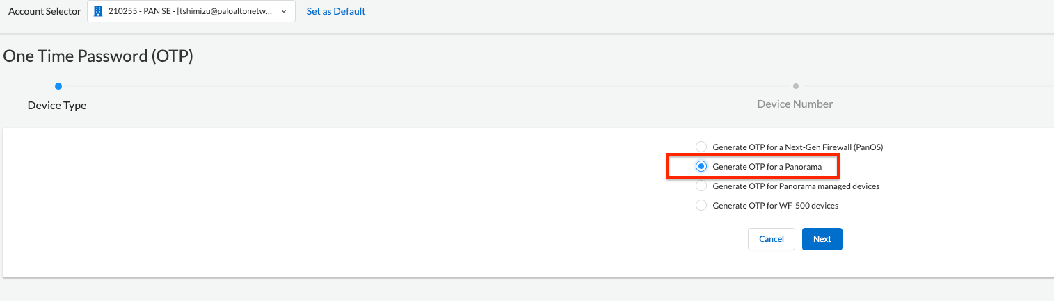 - 对于设备类型,选择“为 Panorama 生成OTP ”,然后单击“下一步” 。