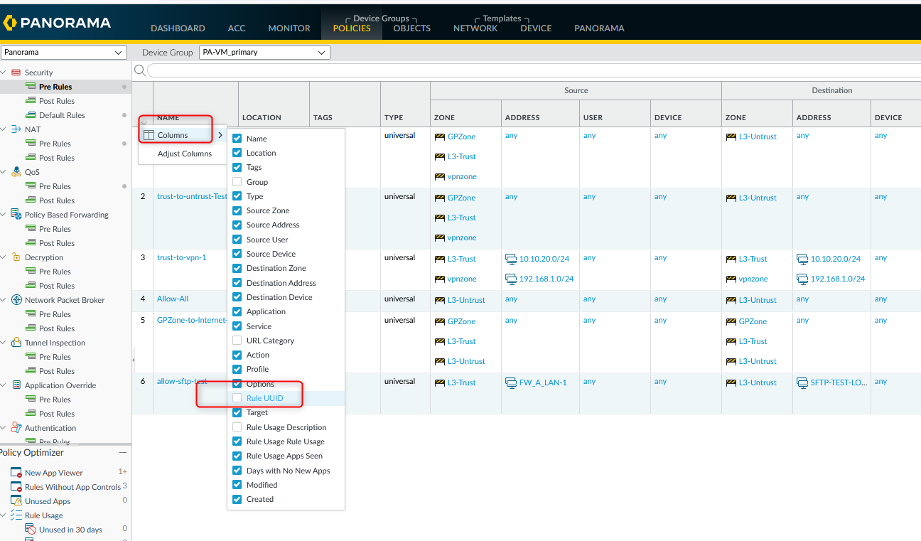 1. You will need the device serial number, device group and security rule uuid. You can get device serial number from firewall or Panorama and use the same uuid from firewall or enable option" Rule UUID" in Panorama to see the UUIDs as shown in screenshot given below and device group from Panorama to use in the command.
