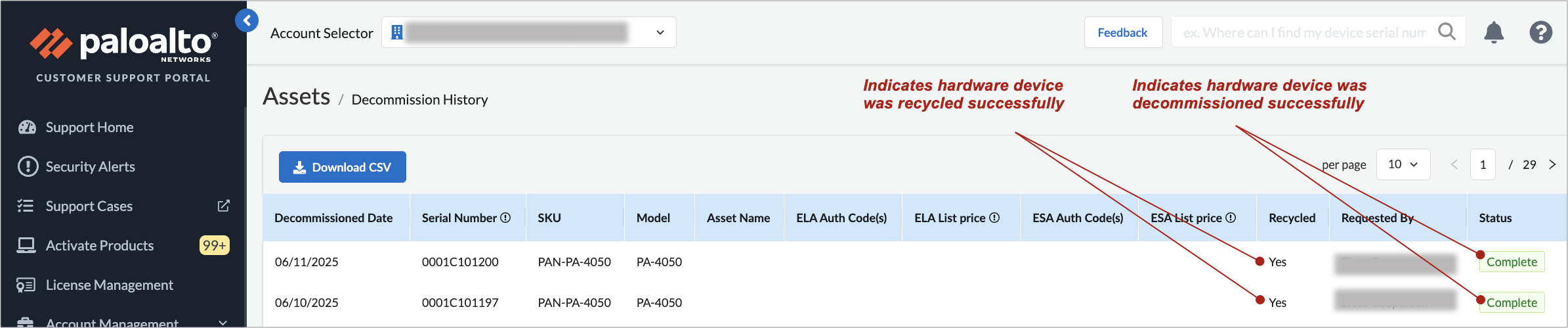 - In Assets page > Account Actions > Decommissioned History, CSP displays a page with the status of previously decommissioned and recycled hardware devices. The sample screenshot shows two PA-Series NGFW's that were successfully decommissioned and recycled.