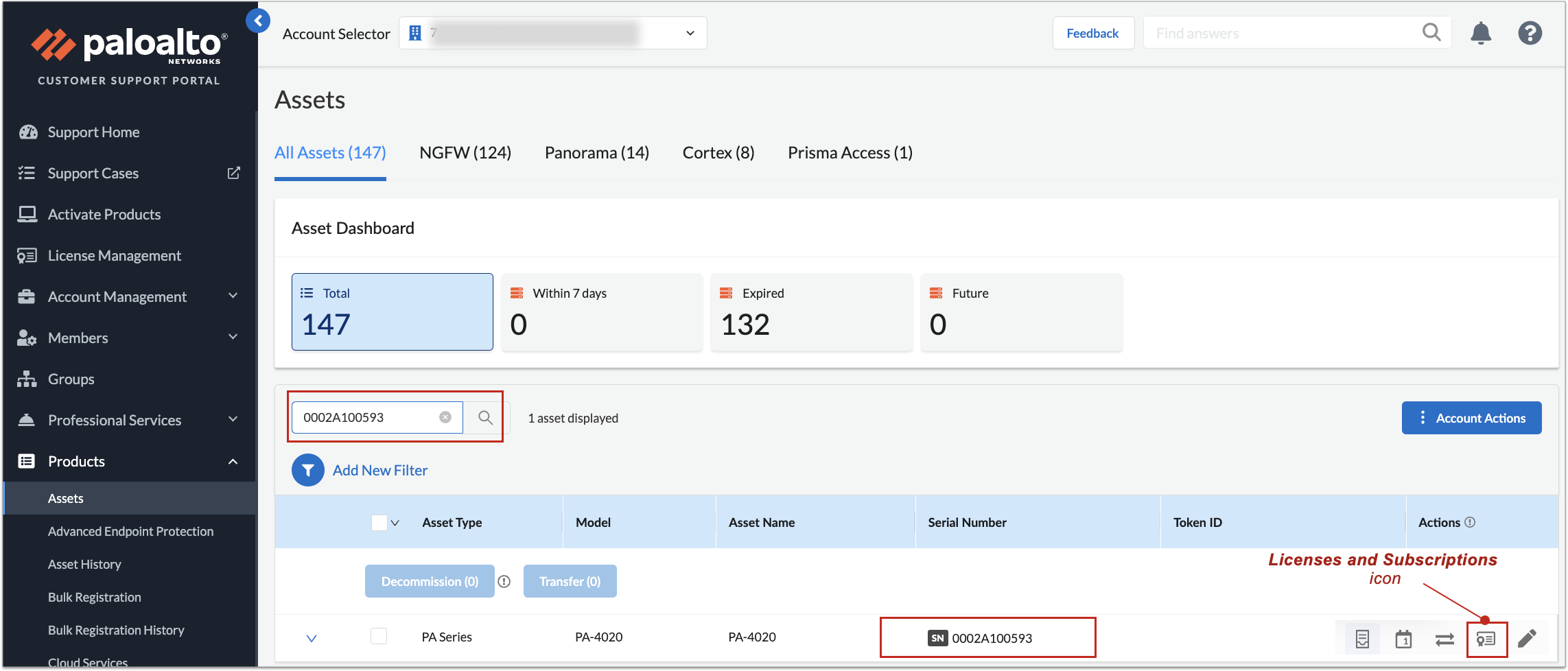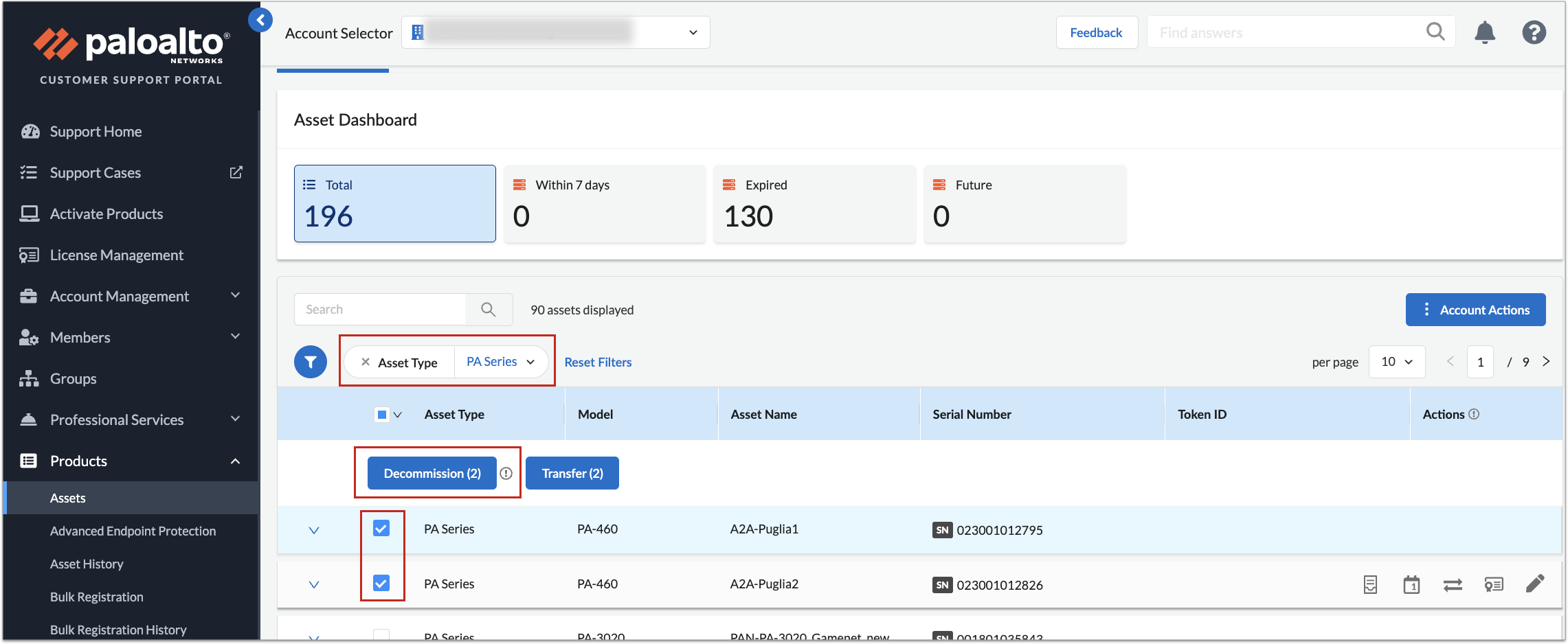 - To view decommissioned PA-Series NGFWs, go to Products > Assets page, click Account Actions > Decommissioned Assets menu.