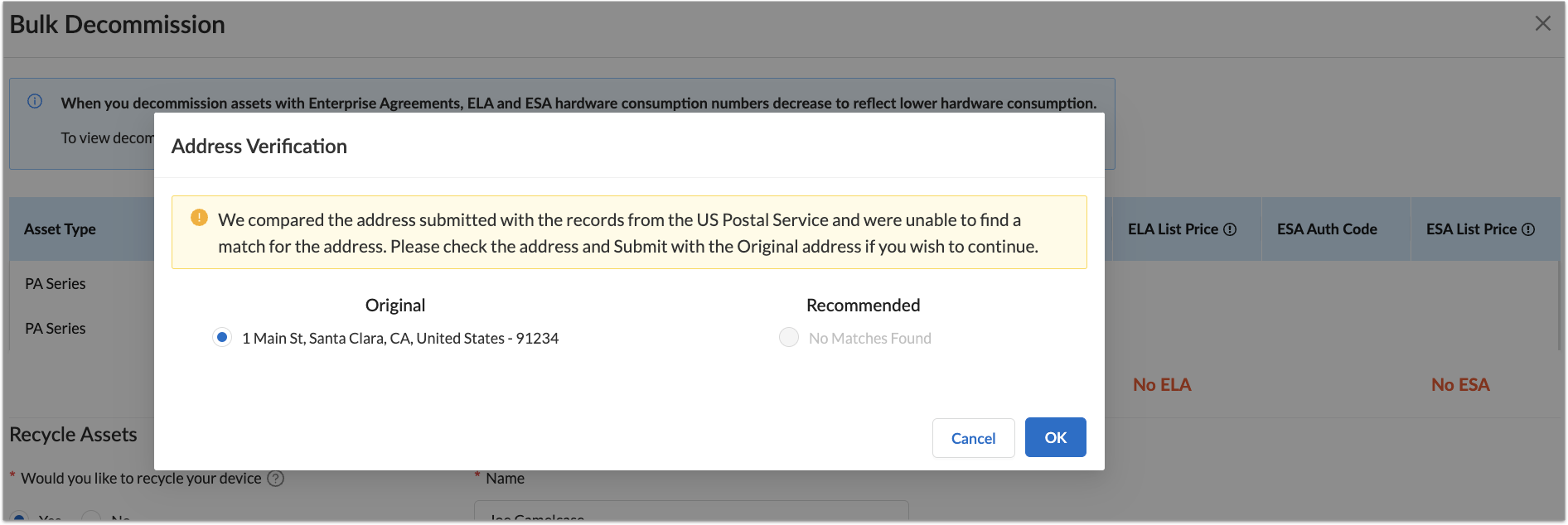 - CSP displays a page to decommission the PA-Series devices you previously selected. Let's assume you also want to recycle these two devices; select Yes to the Recycle Assets question. Then, enter the location where your devices are located. CSP will then create an email indicating where you should send these devices for recycling (the address to send your devices depends on where your devices are located). Click Recycle & Decommission button.