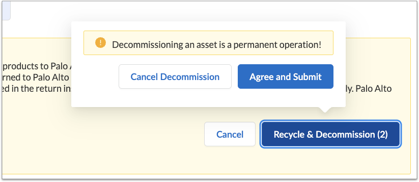 Customer Support Portal enables you to decommission & recycle hardware devices, where decommissioning is defined as taking a hardware device out of service, and recycling is returning a hardware device to Palo Alto Networks for recycling. Please keep in mind decommissioning is a permanent operation.