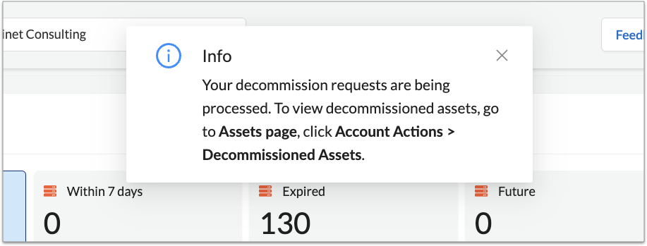 - CSP displays a dialog box indicating your decommission request is being processed. To view the decommissioning status, go to Assets page, click Account Actions > Decommissioned History menu.