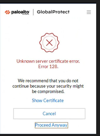 GP Client kann sich nicht authentifizieren mit dem Fehler "Fehler 128 Unbekanntes Serverzertifikat"