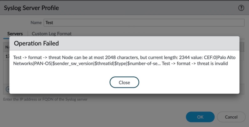 例: 次の例では、脅威ログ形式の現在の長さは 2344 文字で、エラーメッセージが表示されます。