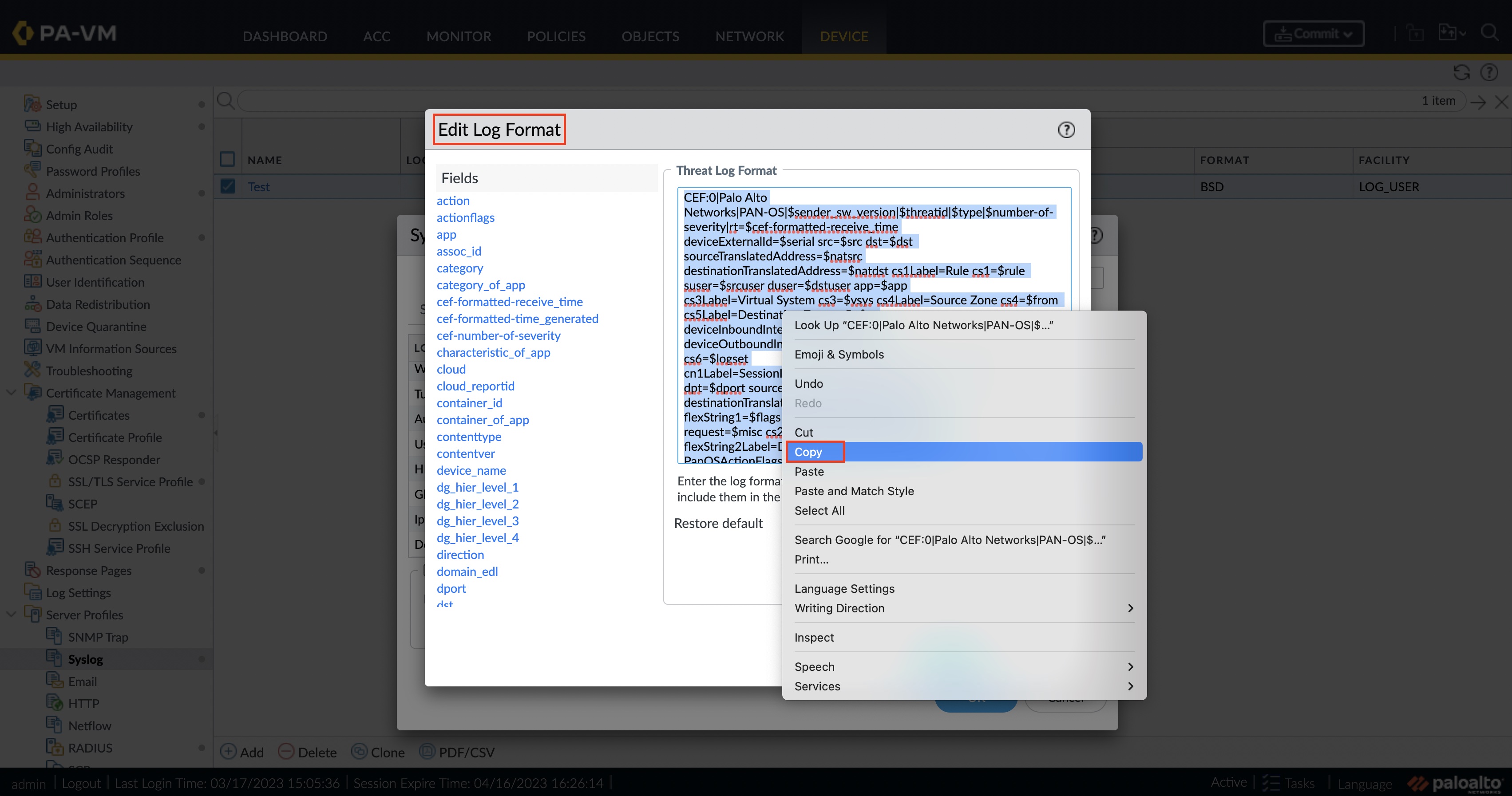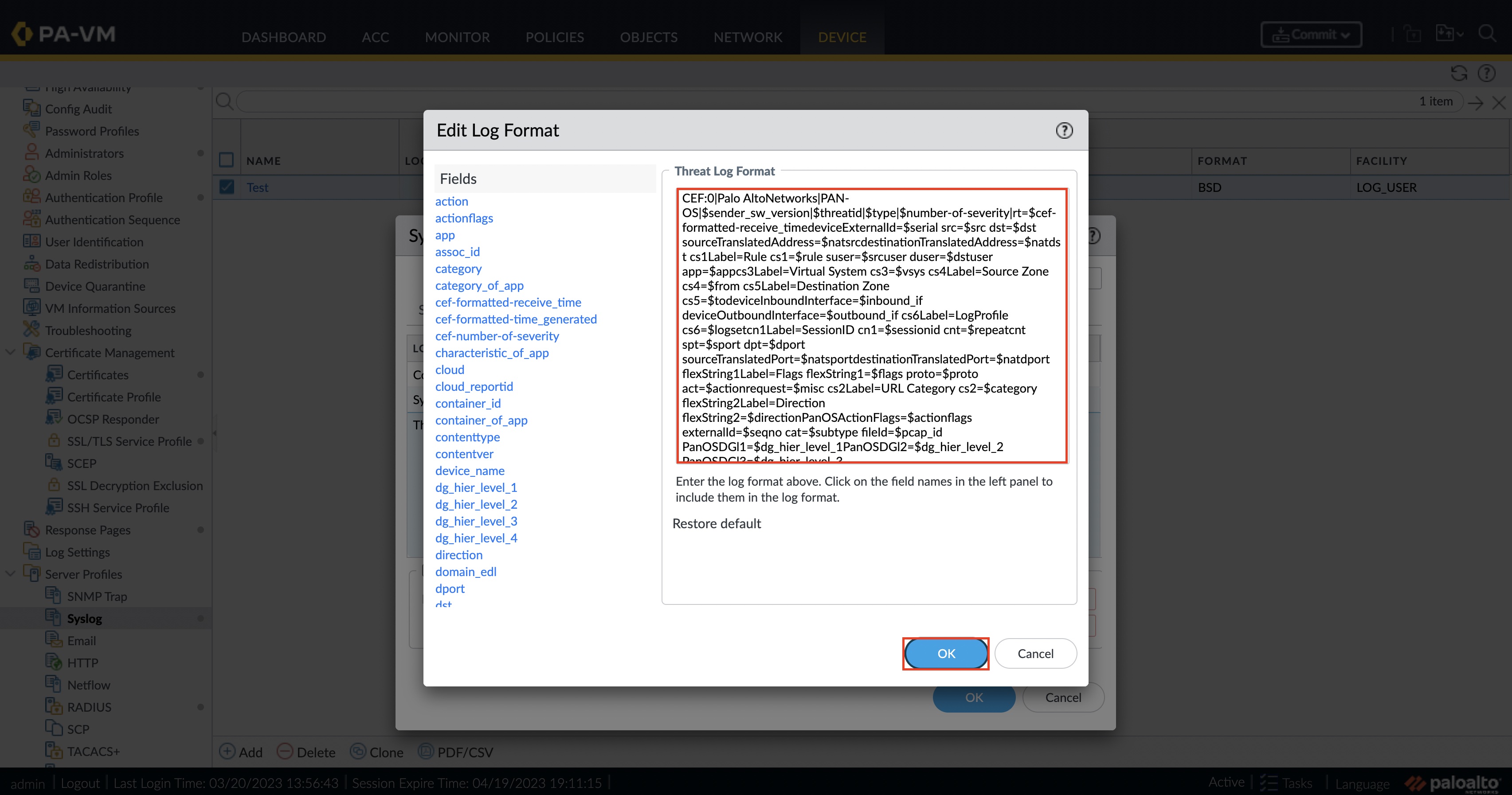 - ステップ7. クリアされた出力を [ Edit Log Format ] ウィンドウに貼り付けます。 [OK] を選択して変更を保存し、[Syslog サーバ プロファイル(Syslog Server Profile)] ウィンドウで [OK] を選択します。 CEF スタイル形式の長さが 2048 文字未満の場合、設定はエラーなしで保存されます。