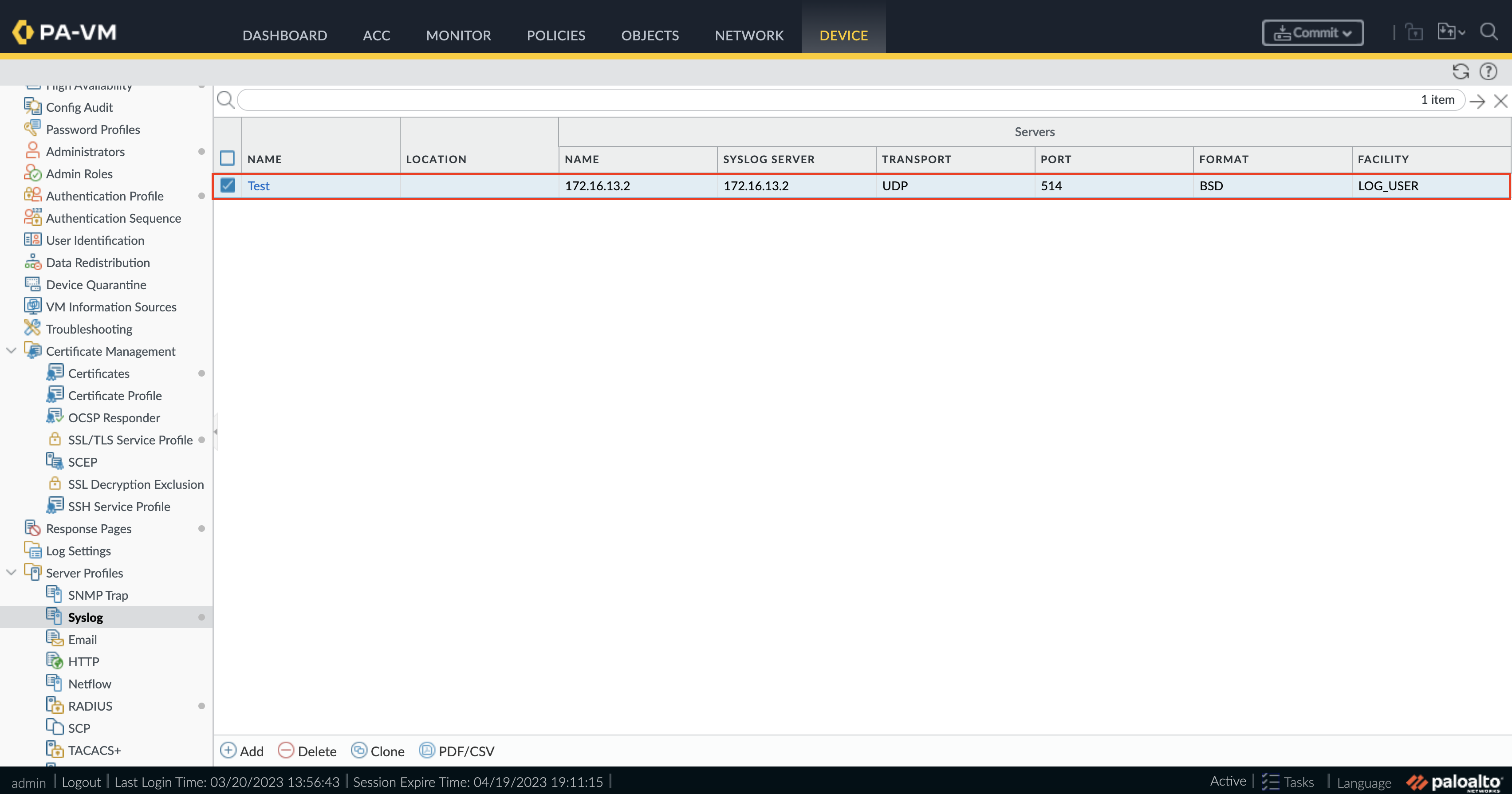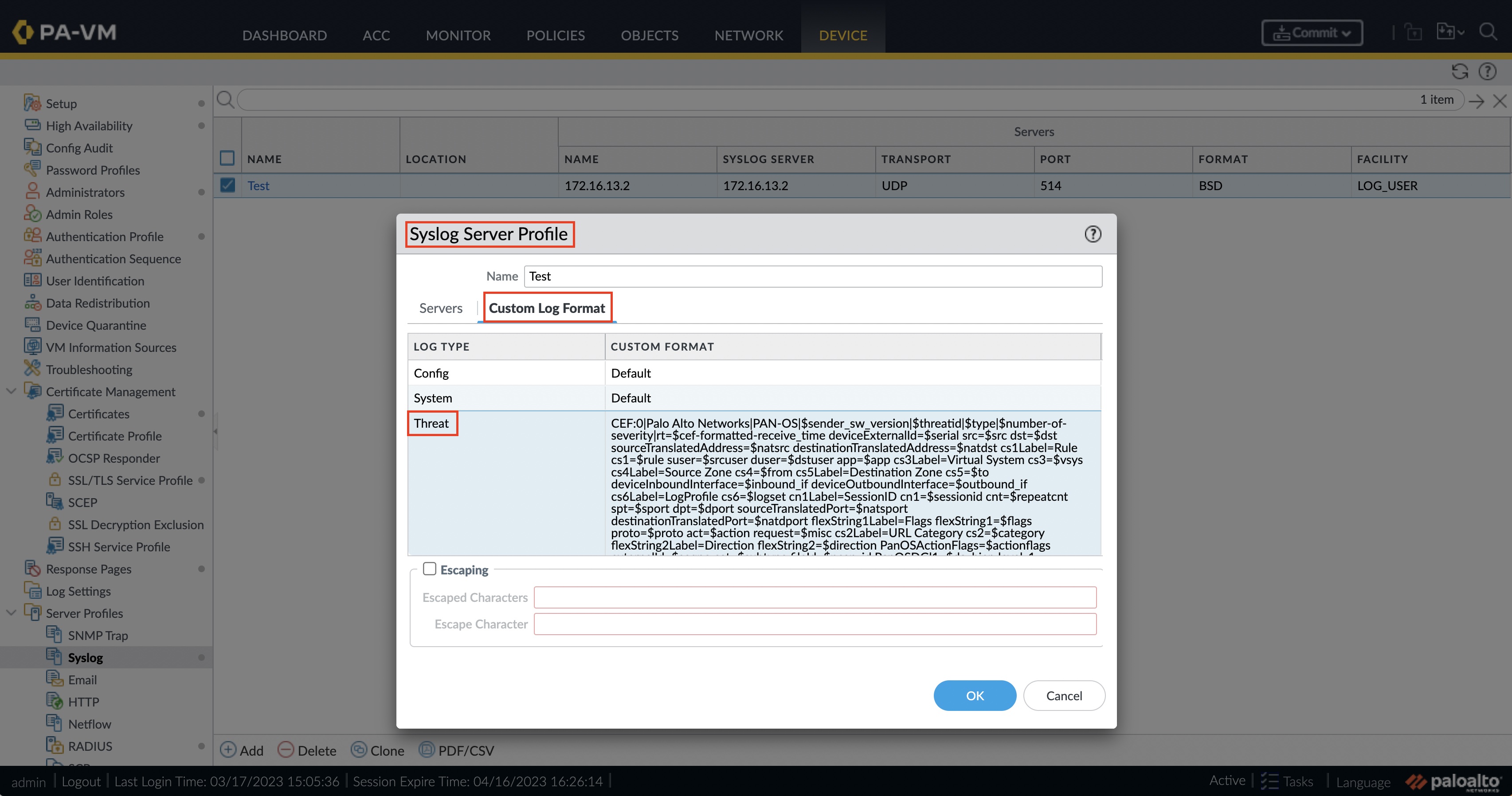 - CEF カスタム ログ形式は、syslog サーバ プロファイル設定内で定義されています