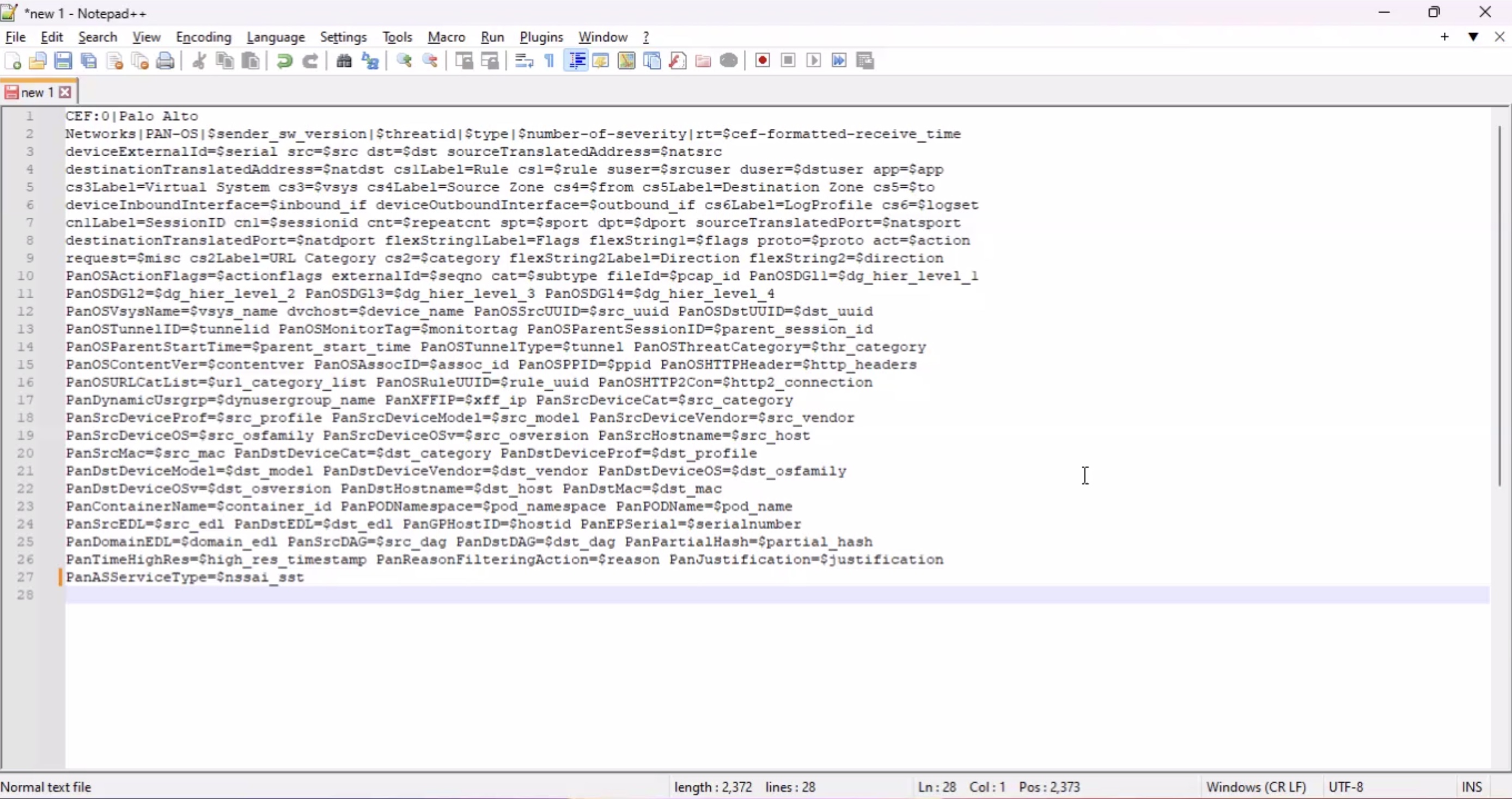- ステップ 4. テキストエディタを有効にして、印刷できない文字を表示します。 PAN-OS統合PDFガイドからCEFログ形式を直接コピーして貼り付けると、各行の末尾にCR / LF文字が追加されているのが一般的です。