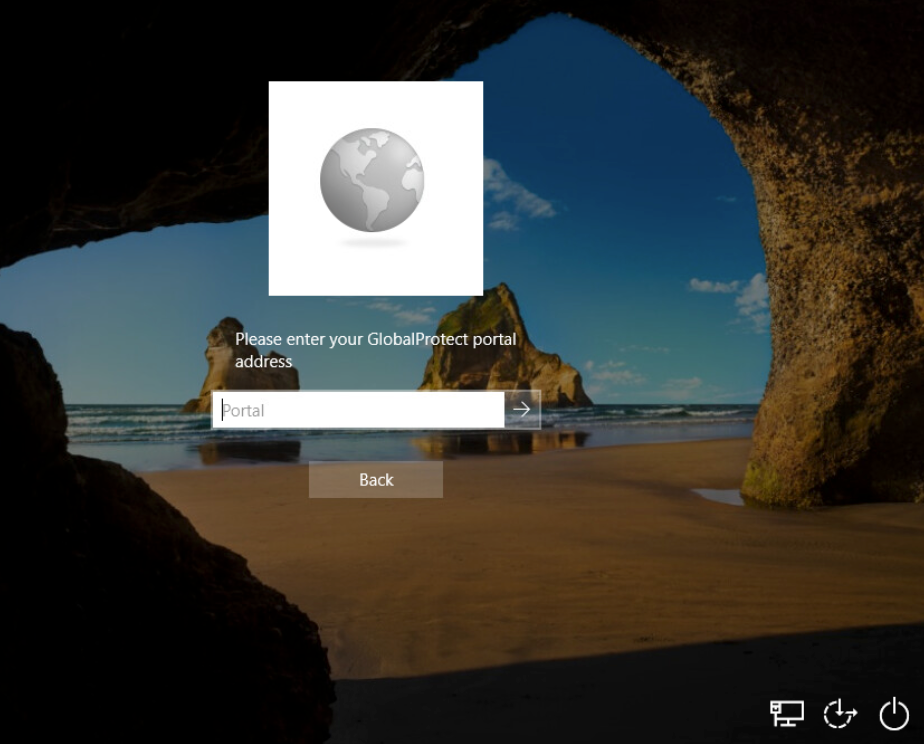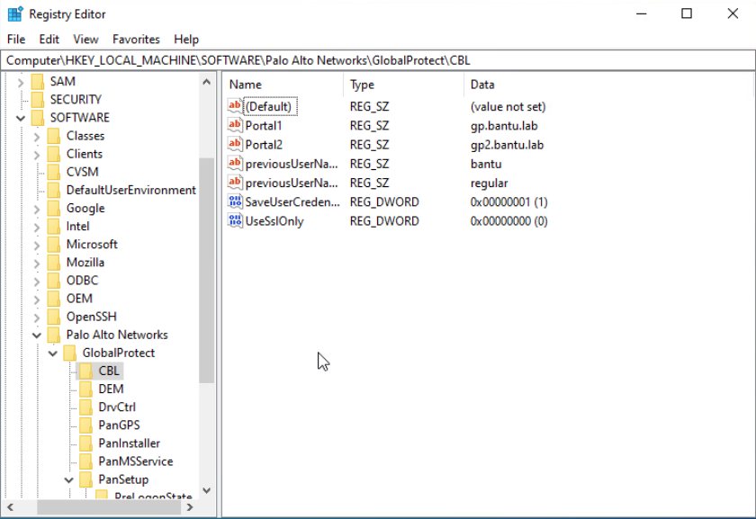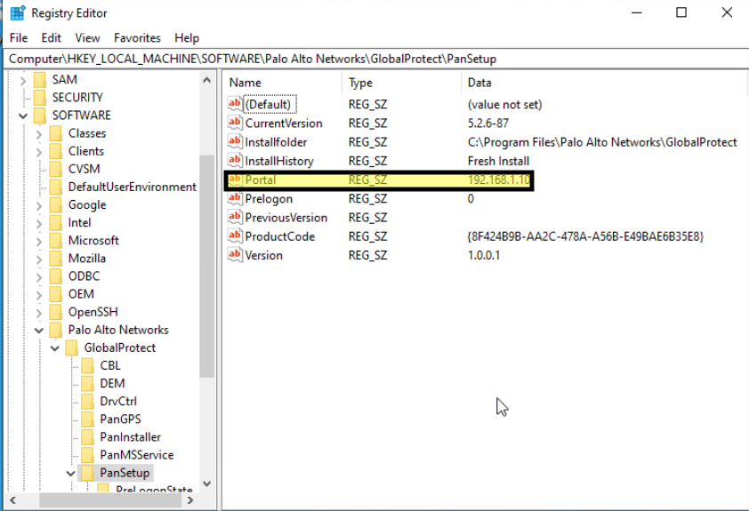 - If configured, Connect Before Logon will use the default portal address or name in the Windows Registry (HKEY_LOCAL_MACHINE\SOFTWARE\PaloAlto Networks\GlobalProtect\PanSetup with key Portal).