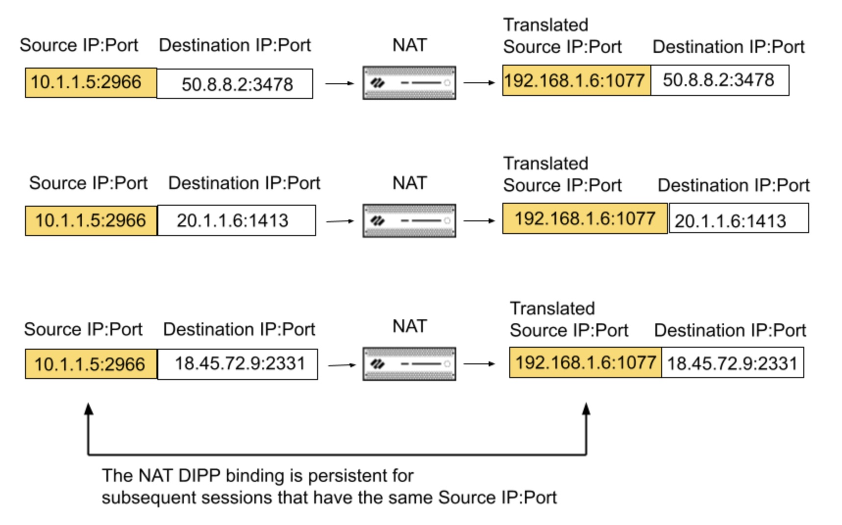 - The same binding is persistent in Session 2 and Session 3, which have the same original source IP address/port as Session 1, but different destination addresses.
