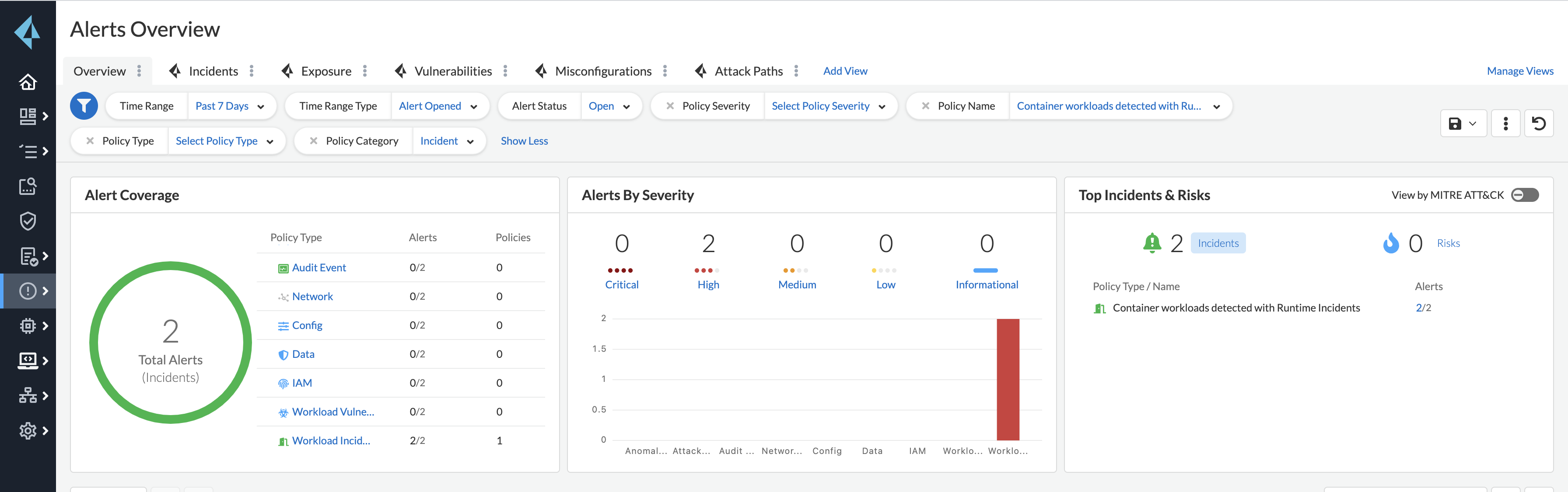- To conclude this, any incident/alerts seen under Incident explorer page on the CWP platform shall show up under alerts for the policy type "Workload Incidents" on the CSPM platform.