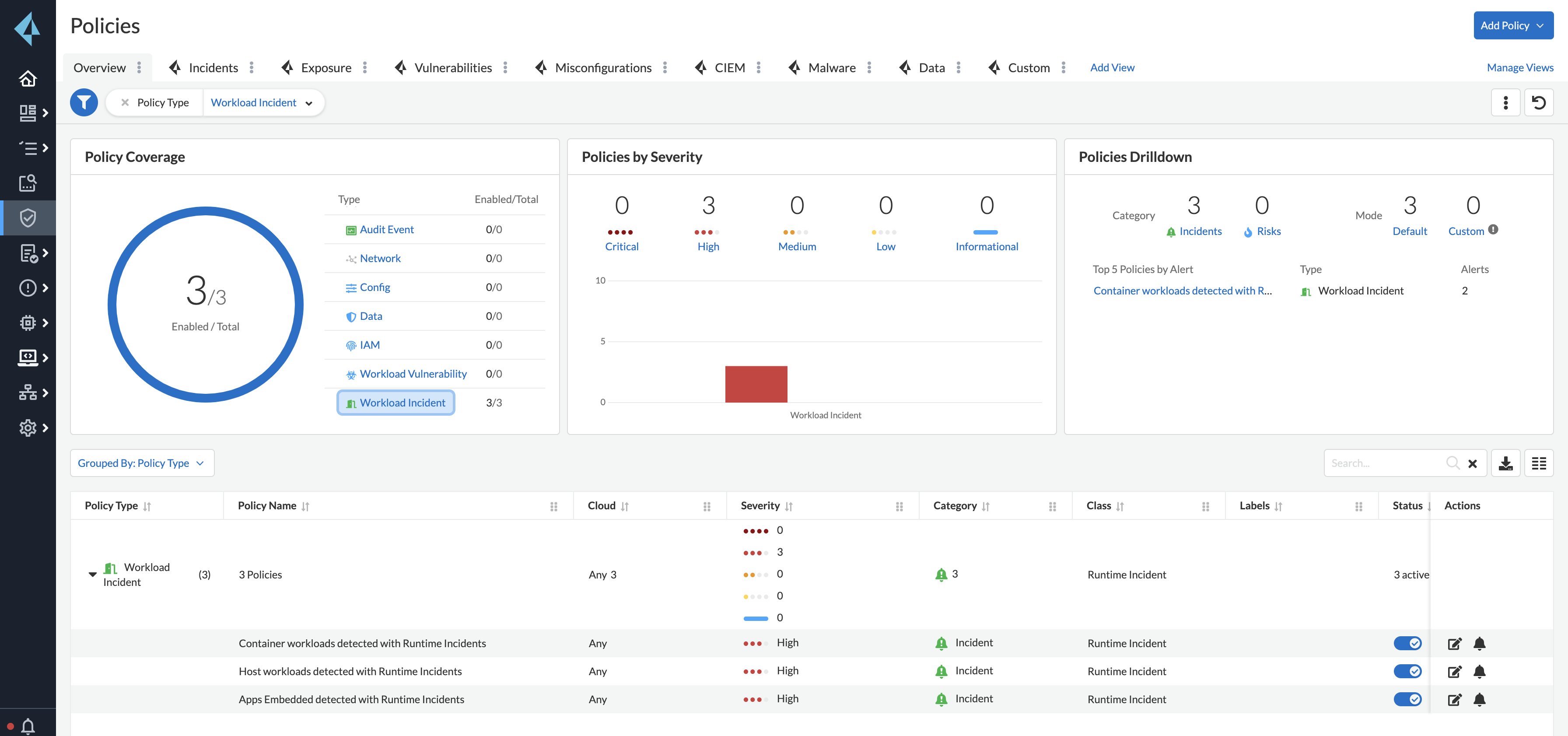 - The policy type "Workload Incidents" on the Prisma Cloud side (Policies > Overview > Policy Coverage > Workload Incidents) falls under Workload Protection Policies on the Prisma Cloud side (CSPM).