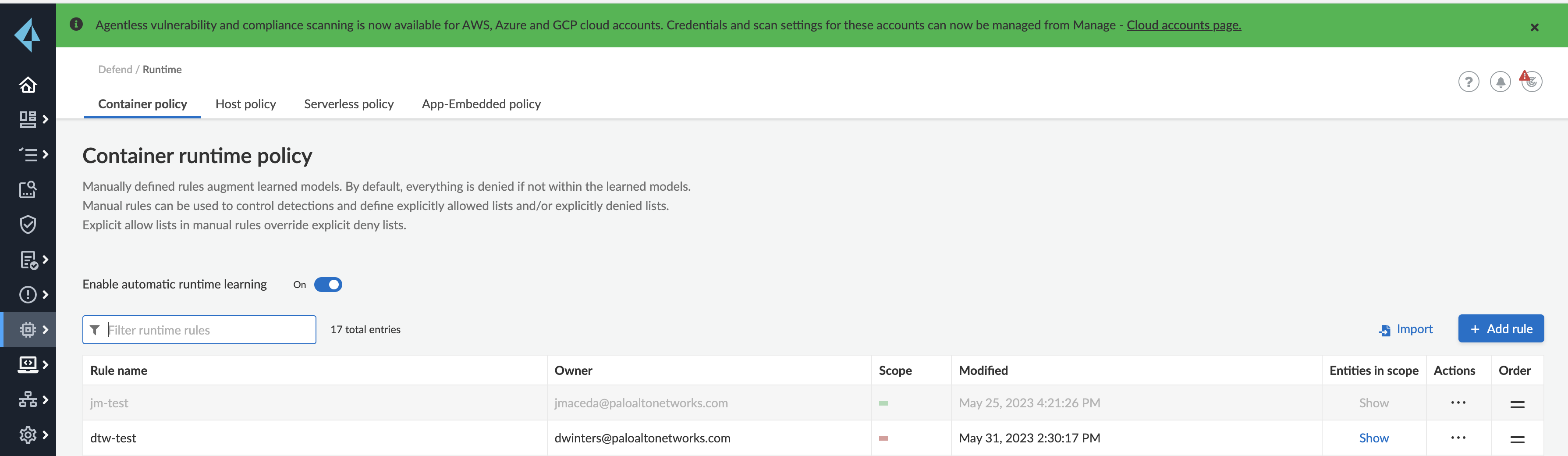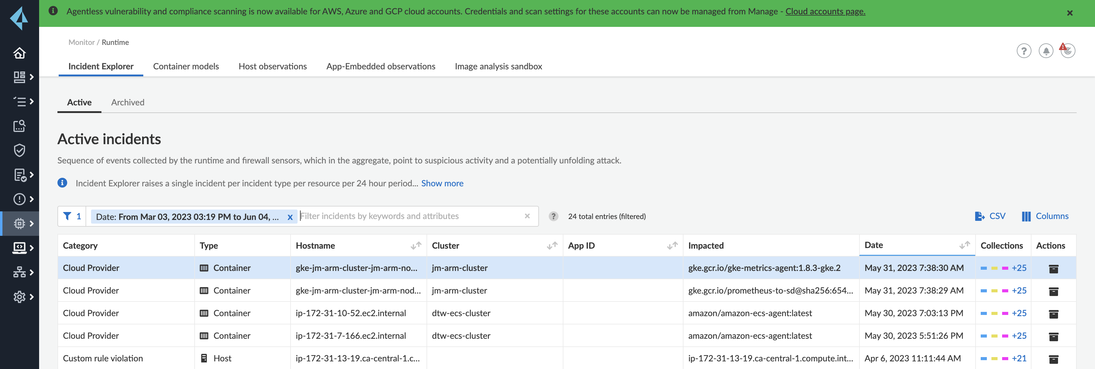 - The results/incidents/alerts seen under Compute > Monitor > Runtime > Incident Explorer may include several Incident types and the output is generated based on the rules set under Compute > Defend > Runtime.