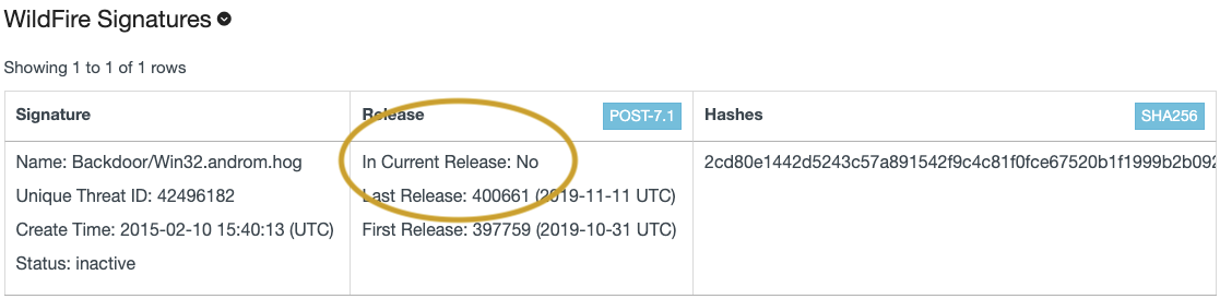 - When searching in Threat Vault for the UTID, the "Threat ID", and the "In Current Release" under the Release column for "WildFire Signatures" will show as "No".