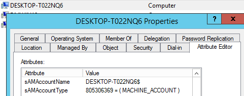 The sAMAccountName attribute for a machine account in Active Directory is the computer name with a trailing '$'.