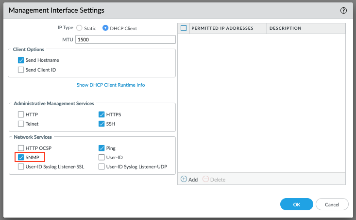 Note: If using an interface apart from Management, make sure that the Interface Management profile associated with the Interface has SNMP enabled.