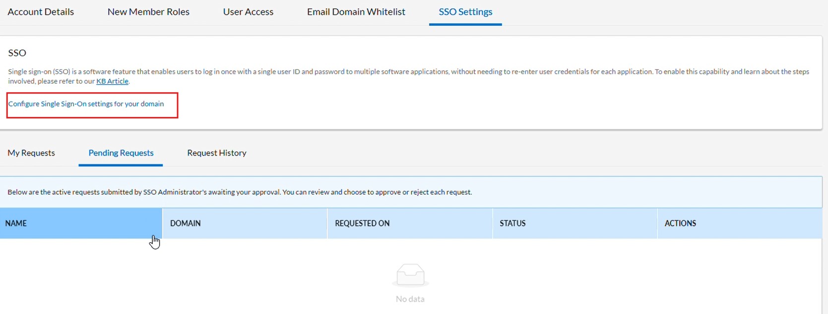 Navigate to the Account Details page and click View Single-Sign-On Settings for your domain.