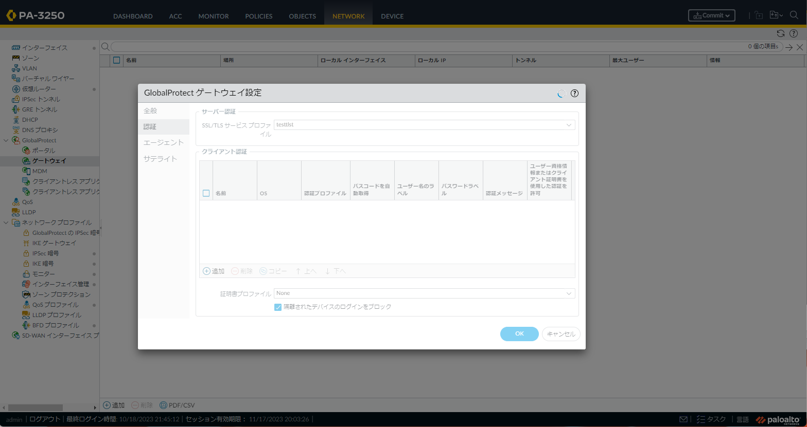 Network > GlobalProtect > Gateways > <Gateway Name> > Agent(エージェント) > Connection Settings(接続設定) > Login Lifetime Expiration Message(ログイン有効期限切れメッセージ)