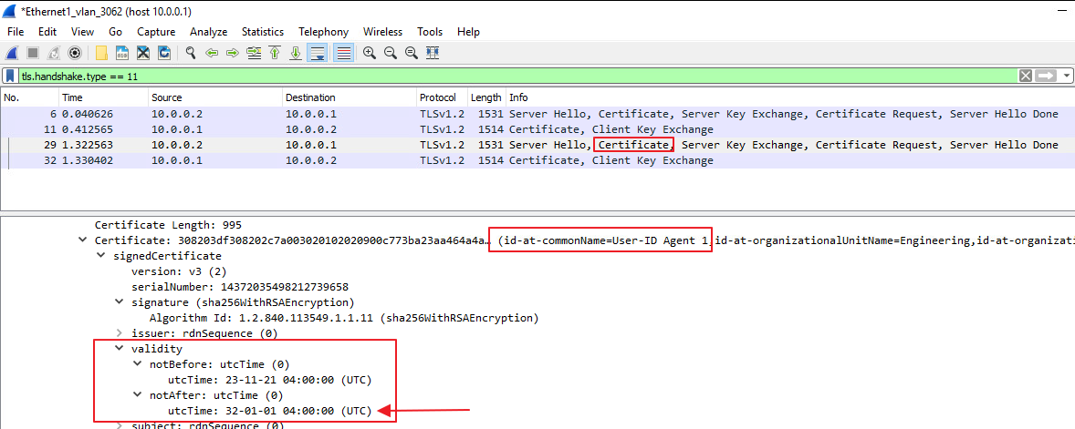 - 在将用户 ID 代理升级到以下任一版本之前“最低目标升级版本”User-ID Agent证书的到期日期为:2024 年 11 月 18 日18:50:33(世界标准时间)如在运行 User-ID Agent 的 Windows 域服务器上从未修补的 User-ID Agent捕获的 Wireshark 图像所示: